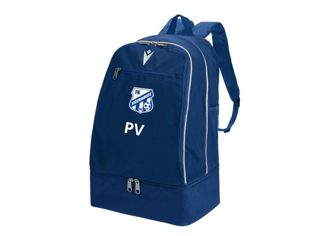 Na přední straně batohu je umístěno logo klubu FK Všeradice a pod logem Macron iniciály hráče, což podtrhuje týmový charakter a profesionální vzhled.
