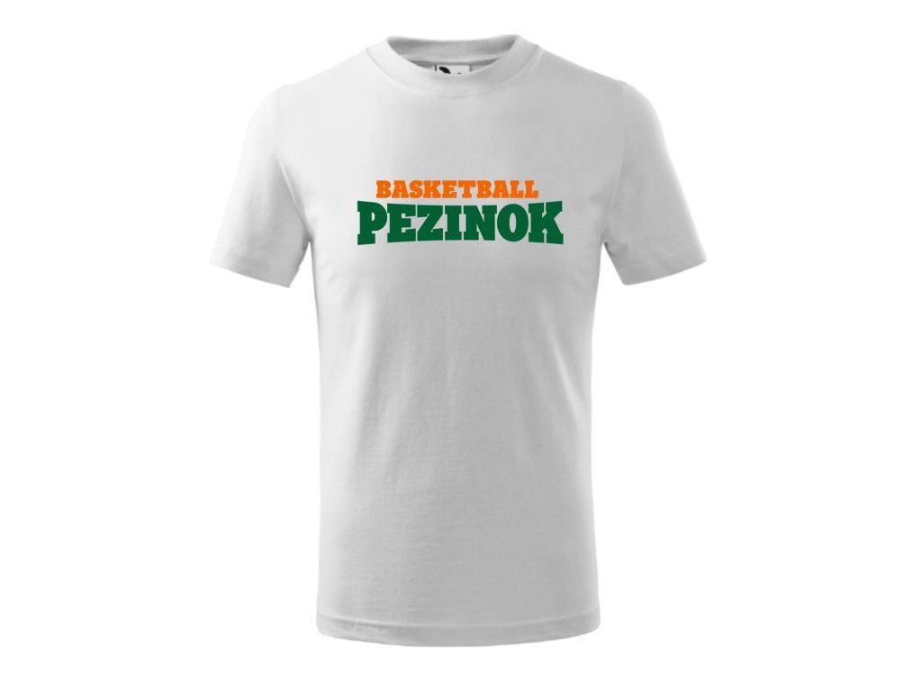 Klasické biele tričko s nápisom "Basketball Pezinok" na prednej strane, kde slovo "Basketball" je v oranžovej farbe a "Pezinok" v zelenej farbe. Ideálne na podporu tímu počas zápasov, tréningov alebo vo voľnom čase.