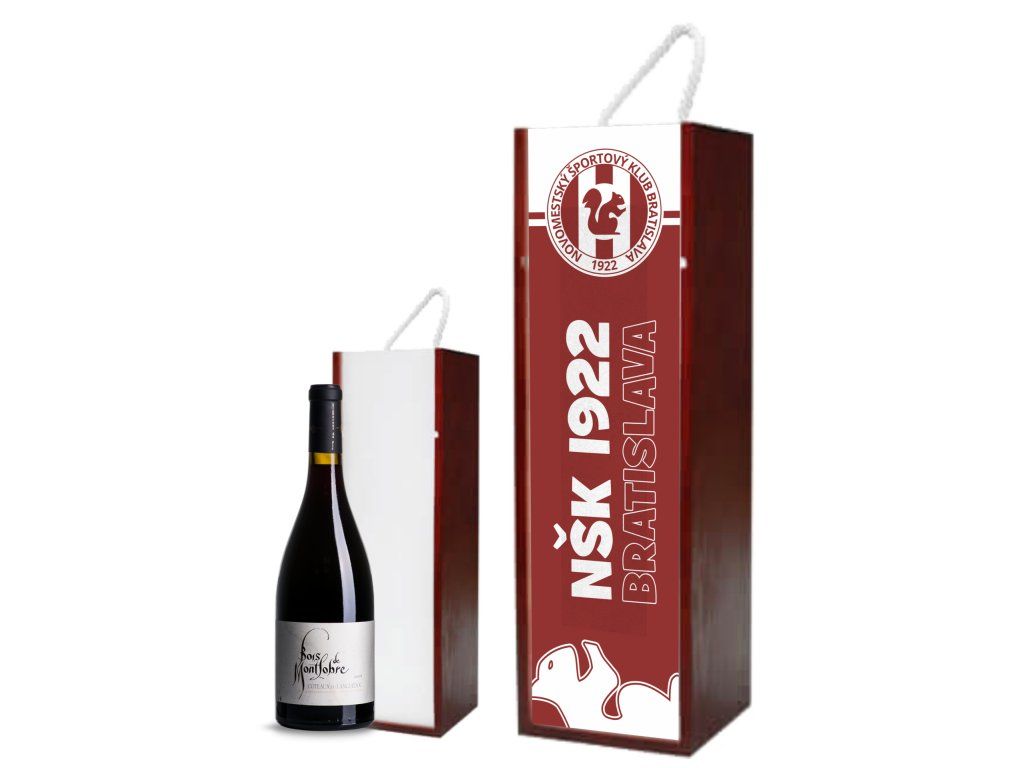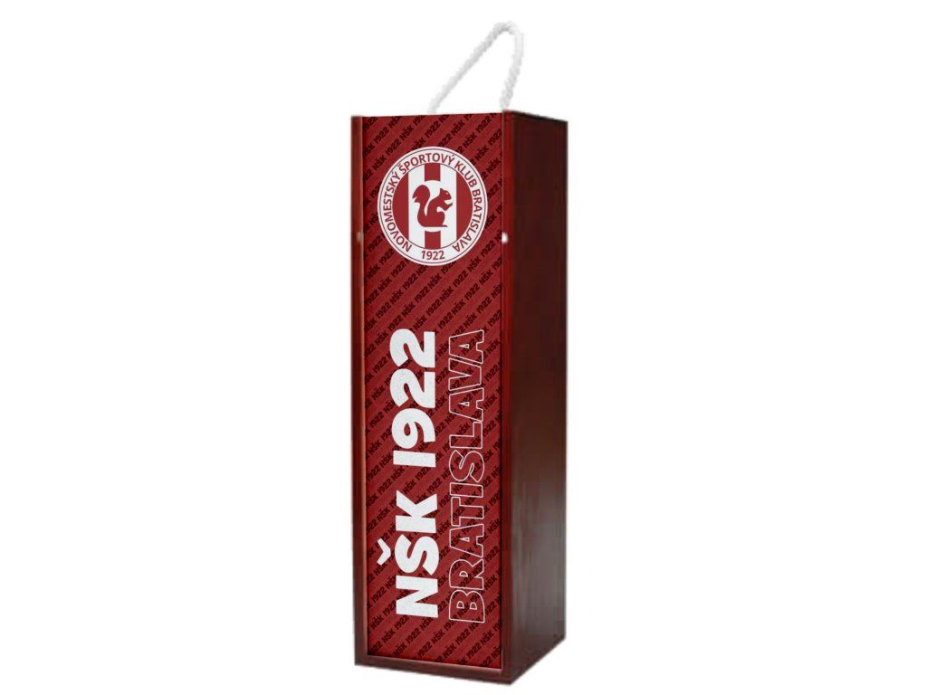 Daruj víno štýlovo a s klubovou hrdosťou! Krabica na víno NŠK 1922 Bratislava v klubovej červenej farbe s logom a názvom klubu je ideálnym obalom, ktorý poteší každého fanúšika. Prezentuj klubový duch aj pri slávnostných príležitostiach.