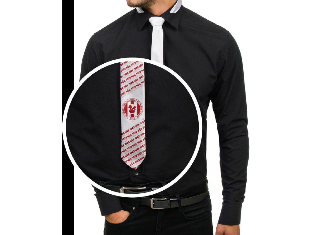 - Opakujúci sa názov klubu na bielej kravate vytvára moderný, no zároveň decentný vzor.