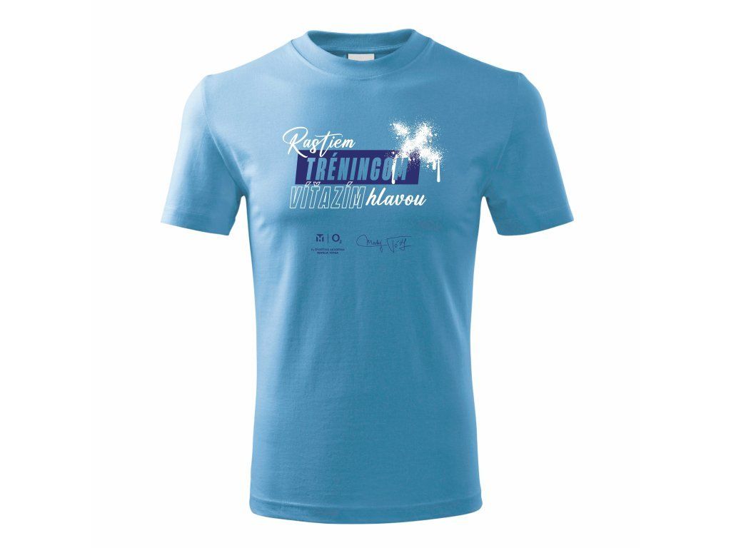 Moderný dizajn trička vychádza zo silného motivačného sloganu, ktorý je hlavným vizuálnym prvkom. Slogan „Rastiem tréningom, víťazím hlavou“ je spracovaný v kombinácii výrazných fontov a striekanej (graffiti) grafiky, ktorá dodáva energiu, odvahu a športového ducha.
