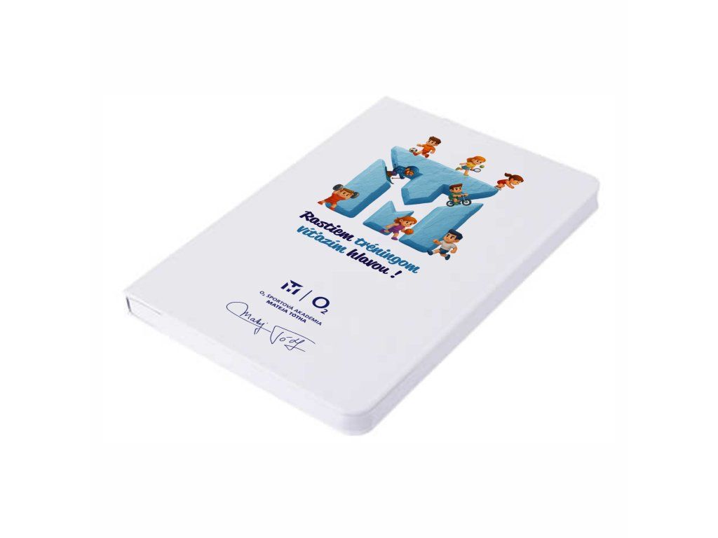 Poznámkový blok je viac než len zápisník – je to nástroj na rozvoj, učenie a motiváciu. Na prednej strane sa nachádza výrazná ilustrácia písmena „M“, okolo ktorého športujú deti – symbol toho, čo predstavuje O2 Športovej akadémie Mateja Tótha: pohyb, hravosť, rast a radosť.