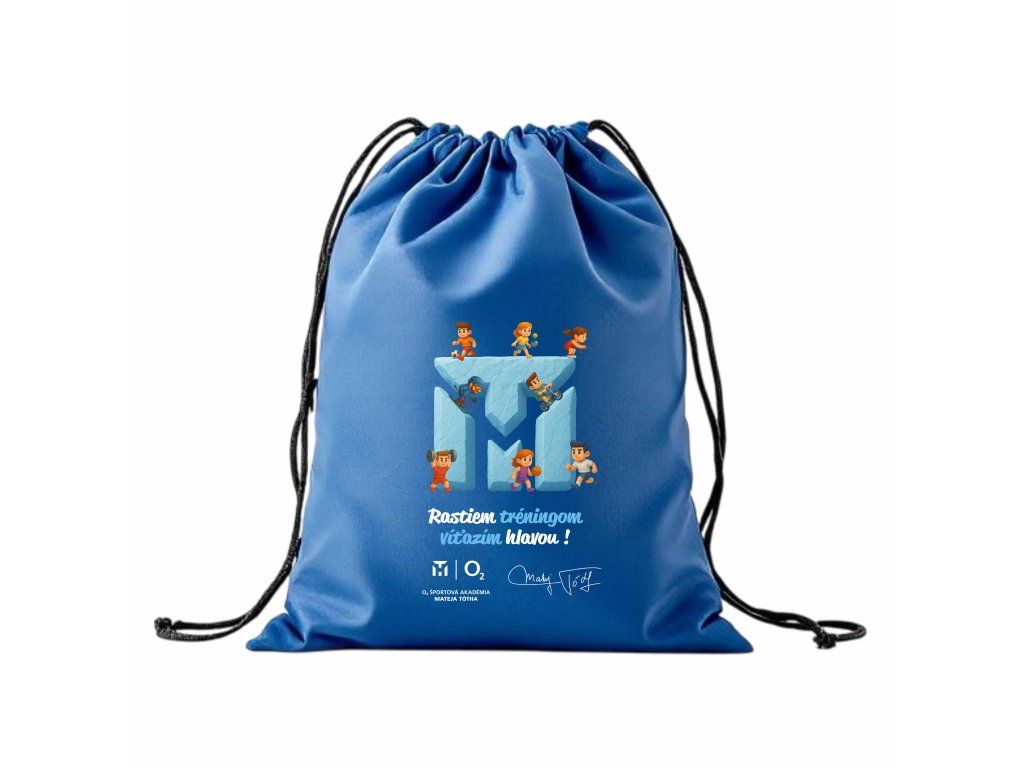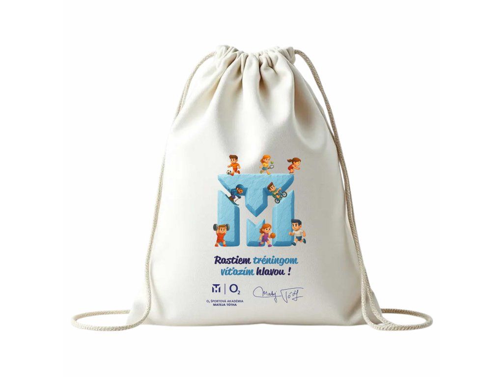 Bavlnený vak so šnúrkami je ideálny pomocník pre každodenné nosenie – do školy, na tréning, na krúžky alebo výlety. Predná strana je potlačená originálnym dizajnom O2 Športovej akadémie Mateja Tótha.