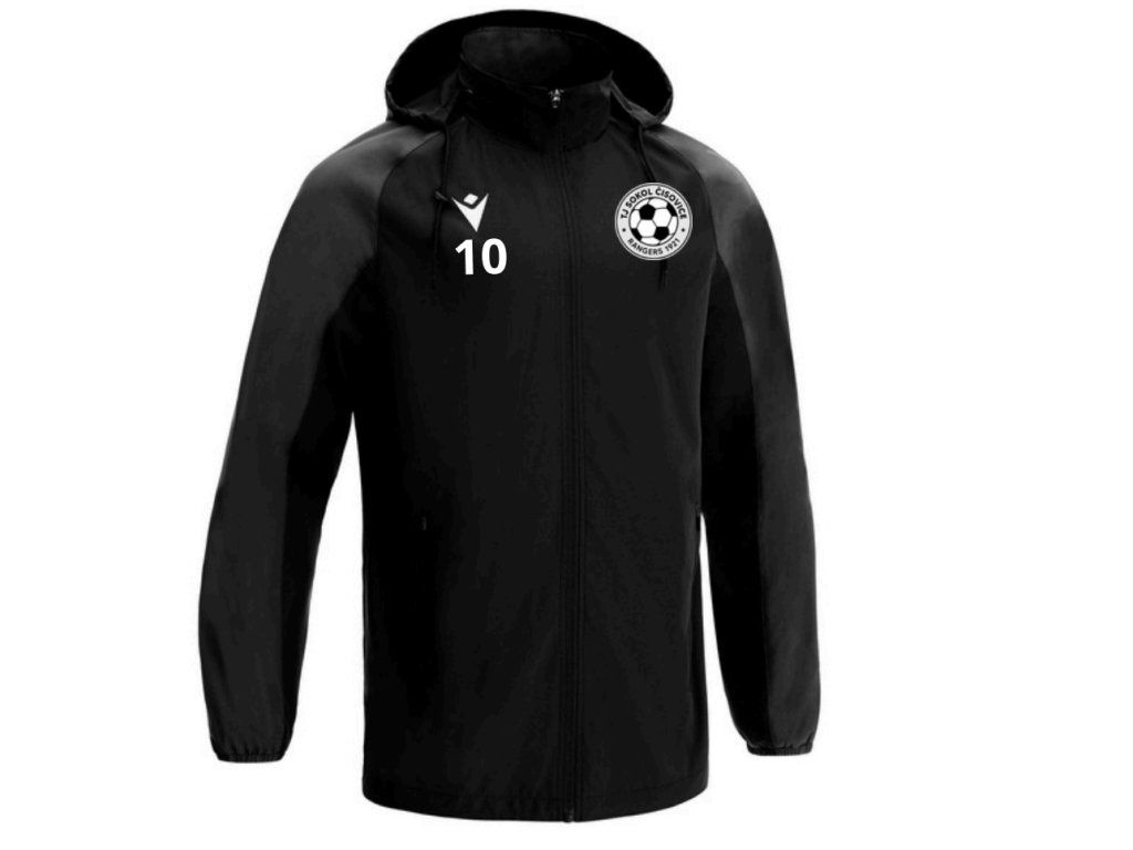 Barva: černá s logem TJ Sokol Čisovice na srdci a personalizací (číslo/iniciály) pod logem Macron.