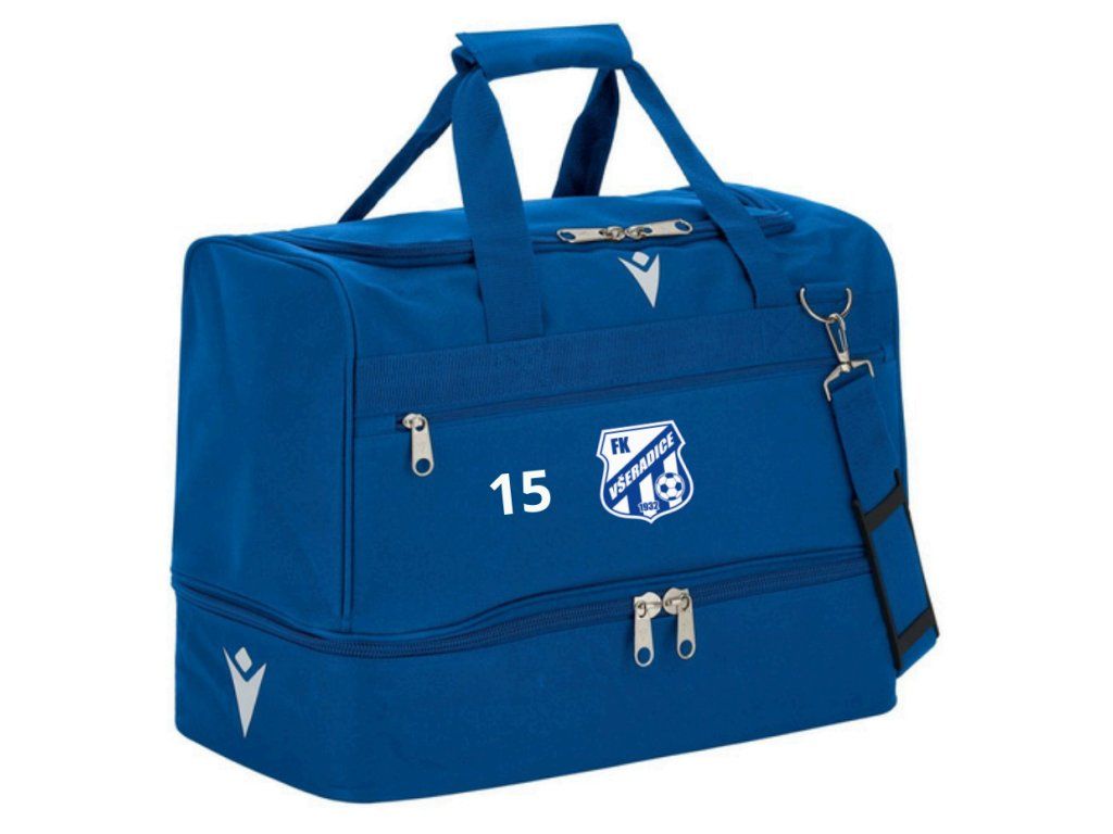 Na přední straně je umístěno logo FK Všeradice spolu s hráčským číslem, které dodává tašce osobní a profesionální vzhled.