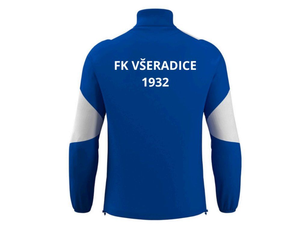 Spodní lem lze upravit pomocí stahovací šňůrky s plastovou zarážkou, takže si hráč může přizpůsobit střih přesně podle potřeby. Na srdci je umístěno logo FK Všeradice, pod logem Macron se nachází hráčské číslo a na zádech nápis FK VŠERADICE 1932, který zdůrazňuje klubovou identitu a tradici.