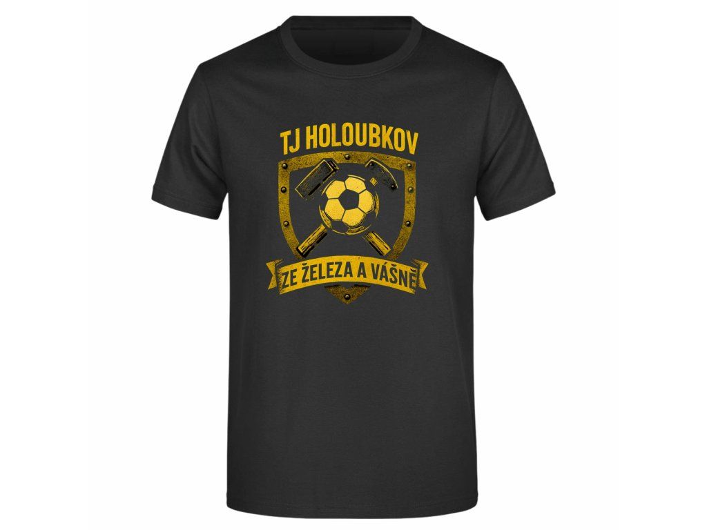 Klasické černé tričko pro fanoušky TJ Holoubkov je ideální volbou na zápasy, klubové akce i běžné nošení. Přední stranu zdobí design loga klubu, zatímco na zádech se nachází výrazný nápis „Holoubkov fans“, který jasně ukazuje podporu týmu.