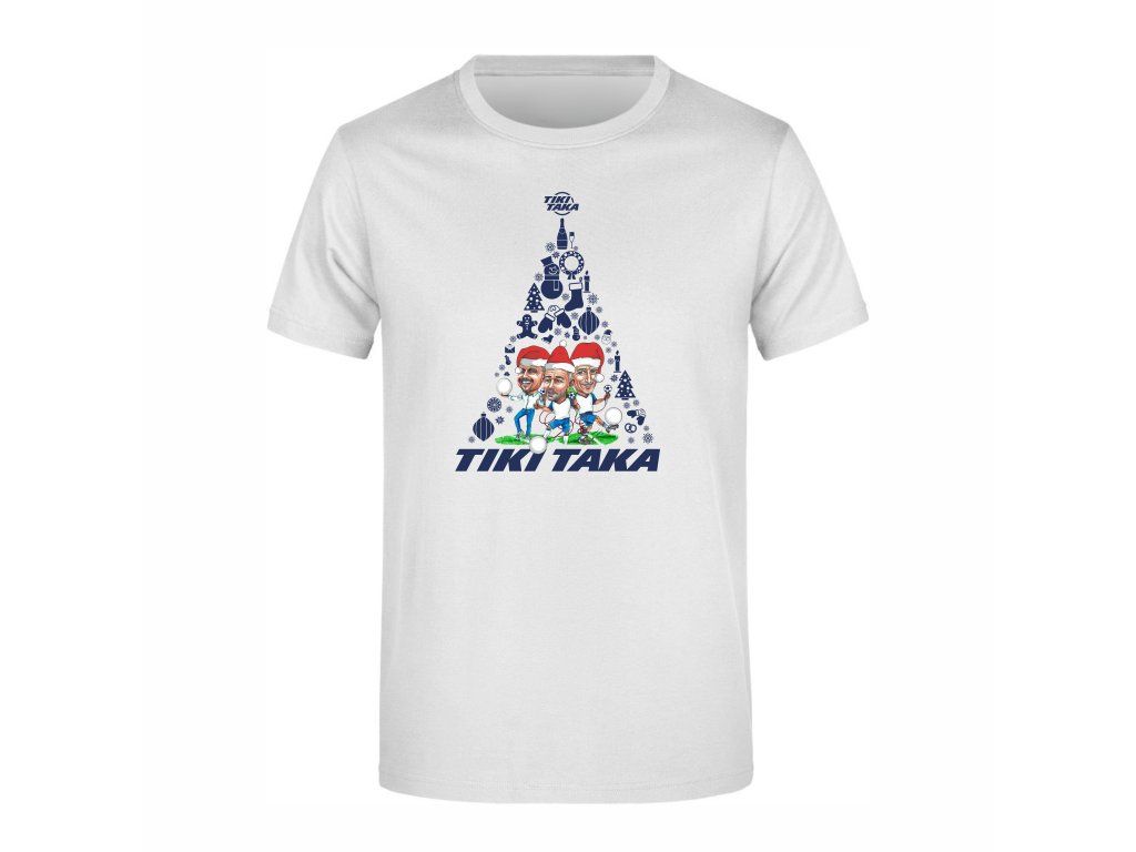Toto sváteční tričko je poctou trojici nejvýraznějších postav pořadu TIKI TAKA – Petr Svěcený, Vladimír Šmicer a Peter Švancara. Grafika spojuje vánoční motiv ve tvaru stromku s typickým humorem této oblíbené fotbalové relace.