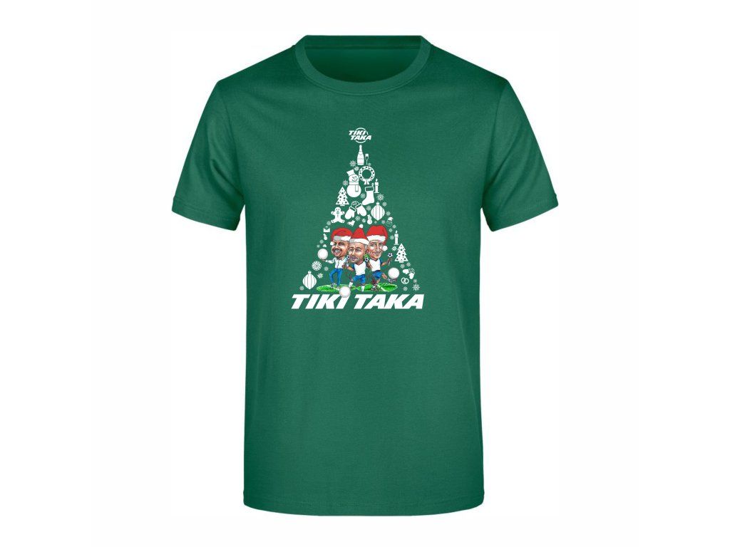 Toto sváteční tričko je poctou trojici nejvýraznějších postav pořadu TIKI TAKA – Petr Svěcený, Vladimír Šmicer a Peter Švancara. Grafika spojuje vánoční motiv ve tvaru stromku s typickým humorem této oblíbené fotbalové relace.