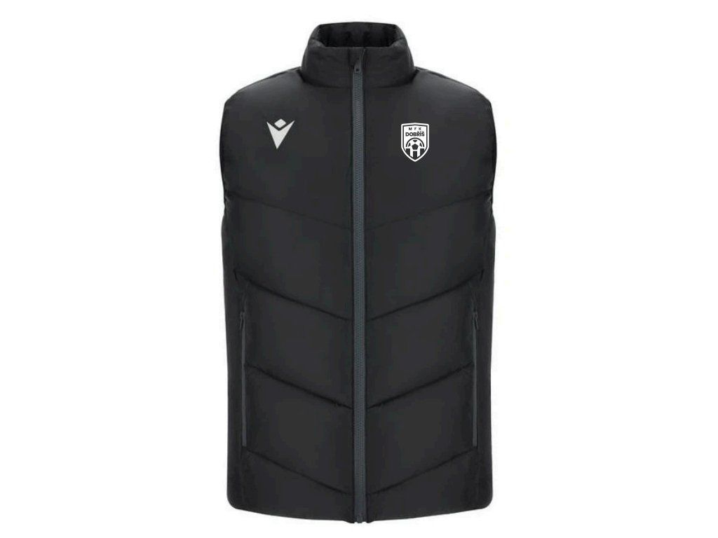 Průramky jsou zakončeny lycrovým lemem, který zajišťuje pohodlné přiléhání a volnost pohybu. Na hrudi je umístěno logo MFK Dobříš, díky čemuž je vesta ideální součástí klubového outfitu pro trénink, cestování i volný čas.
